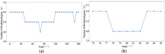 Influence of segmentation angle on the number of divided sub-regions. (a) Sub-region count variation with 5° segmentation angle intervals from 0° to 180°. (b) Refined analysis using 1° intervals from 75° to 85°.