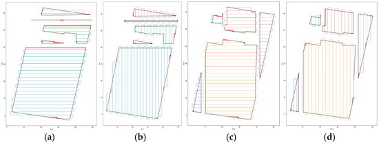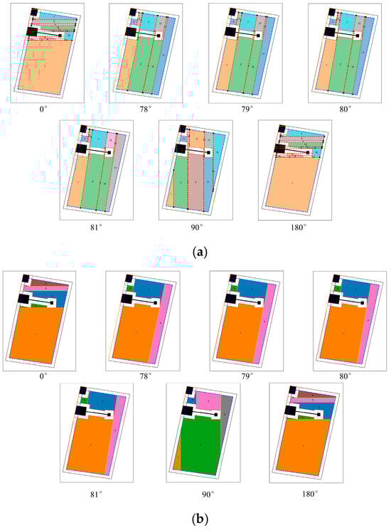 In addition to the four selected angles with superior performance, three conventional segmentation angles—0°, 90° and 180°—were included for comparison as baseline references. As shown in Figure 8b, the boustrophedon-based method produced significantly fewer subregions than the traditional trapezoidal decomposition (Figure 8a), highlighting its advantage in reducing segmentation complexity.