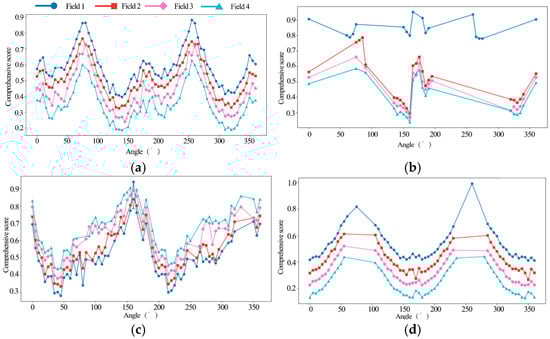 Figure 9a–d illustrate the relationship between the working direction and the composite score for the four selected fields under each segmentation angle. Based on the results, the 78° segmentation scheme was ultimately selected as the optimal planning strategy.