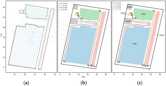 In this experiment, four subfields (labeled 1–4) were selected, with the initial starting point set at field 1’s entrance located at coordinates (29.615, −1.09). Following the algorithmic workflow described in Section 2.4, the initial inter-field connection paths were generated using an eight-directional A* search on a 0.10 m resolution occupancy grid. This raw polyline output was then sequentially refined through a series of post-processing steps: polyline simplification using the Douglas–Peucker algorithm with tolerance ε = 1.5 m, arc-based corner smoothing with a minimum radius of 1.0 m, and Chaikin subdivision and cubic B-spline interpolation for final smoothing. The resulting transition paths are shown in Figure 11c.