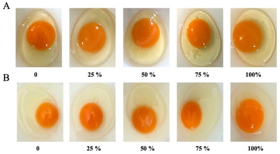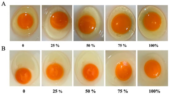 In the 4th and 8th weeks of the experiment, 90 eggs were collected each time (3 eggs/replicate, 18 eggs/treatment) and stored at 4 °C for 0, 2, 4, and 6 weeks, respectively. The egg yolk was subjected to sensory evaluation according to the proportion of spots or plaques on the surface of the egg yolk and the degree of discoloration provided by Davis et al. []. A sensory score of ≥3 was deemed unacceptable (OBJ).
