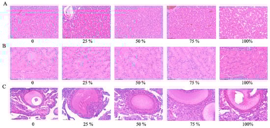 Effect of DGCP replacement level on liver, magnum fallopian tube, and ovary histopathology of layers fed the experimental diets (40×). (A) liver histopathology; (B) magnum fallopian tube histopathology; (C) ovary histopathology.