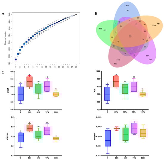 (A) Cumulative box plot of species. Abscissa: sample size; ordinate: ASV count. (B) Venn diagram of ASV distribution. Each circle represents a group; the overlapping areas indicate shared ASVs; non-overlapping areas indicate unique ASVs. (MA) Control group. (MB) 25% DGCP group. (MC) 50% DGCP group. (MD) 75% DGCP group. (ME) 100% DGCP group. (C) Alpha diversity index. a–c Value differences in the same row differ significantly (p < 0.05) (n = 6).