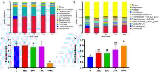 Figure 5A displays the top 10 clades by maximum relative abundance, with the remainder grouped as Others. Bacteroidota showed the highest relative abundance, followed by Campylobacterota and Firmicutes. Figure 5B shows the 10 genera with the highest relative abundance of species, with Bacteroides, Campylobacter, and Fusobacterium as the dominant genera. Both Bacteroidota and Bacteroides increased linearly with the amount of DGCP. As can be seen in Figure 5C,D, Fusobacteriota was significantly lower (p < 0.05) and Desulfobacterota was significantly higher (p < 0.05) in the 100% replacement group compared to all other treatment groups.