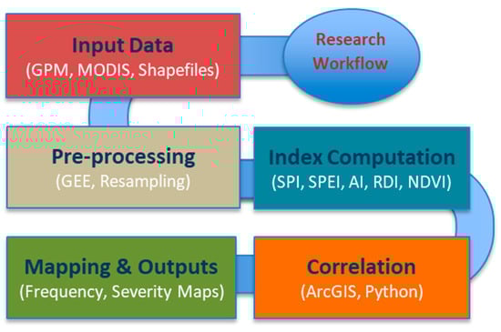 Figure 1 illustrates the overall research workflow employed in this study. The process begins with the acquisition of multi-source input data, including GPM precipitation, MODIS-based PET and NDVI products, and administrative shapefiles. These datasets undergo systematic pre-processing and resampling in Google Earth Engine (GEE) version v1.5.24rc0 to ensure spatial and temporal consistency. Subsequent stages involve the computation of five drought-related indices (the SPI, SPEI, AI, RDI, and NDVI anomaly) and the generation of spatiotemporal drought frequency and severity maps. Finally, correlation analyses are conducted using ArcGIS Pro version 3.1 and Python version 9.3 to examine the relationships between drought indices and vegetation response, providing an integrated framework for drought monitoring in rainfed rice areas.