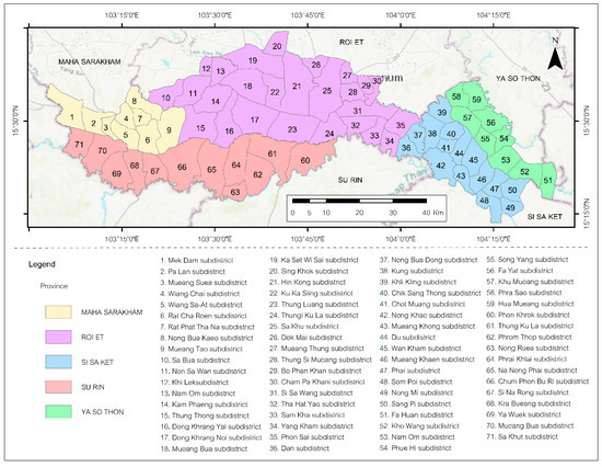 Thung Kula Ronghai is a prominent rainfed rice production zone located in Northeastern Thailand, covering approximately 3800 square kilometers across five provinces: Roi Et, Surin, Maha Sarakham, Si Sa Ket, and Yasothon. The region is topographically characterized by low-lying plains with sandy and saline soils that pose challenges for water retention and crop productivity. The area relies primarily on seasonal monsoon rainfall to sustain extensive paddy fields, which makes it particularly sensitive to rainfall variability and recurring drought conditions. Figure 2 illustrates the spatial extent of the study area.
