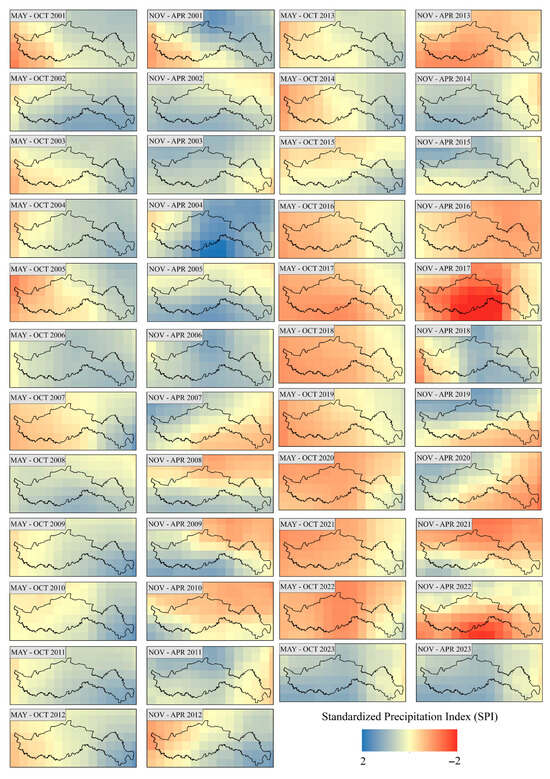 During 2001–2005, SPI values were predominantly positive across the region, suggesting above-average rainfall conditions. However, isolated red zones indicated localized drought pockets in 2001, 2005, and 2007. From 2016 to 2022, a marked shift toward negative SPI values was observed, with 2017 standing out due to widespread and intense dry conditions.