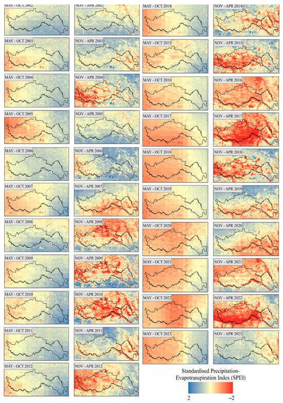 Figure 4 presents the time series of the Standardized Precipitation-Evapotranspiration Index (SPEI) across Thung Kula Ronghai from 2001 to 2023, segmented into the wet season (May–October) and dry season (November–April). These maps depict the spatiotemporal variability in the regional water balance, derived from the difference between precipitation and potential evapotranspiration. Positive SPEI values (blue) indicate wetter-than-normal conditions, negative values (red) signify drier-than-normal conditions, and yellow to white areas represent near-average climatic conditions.