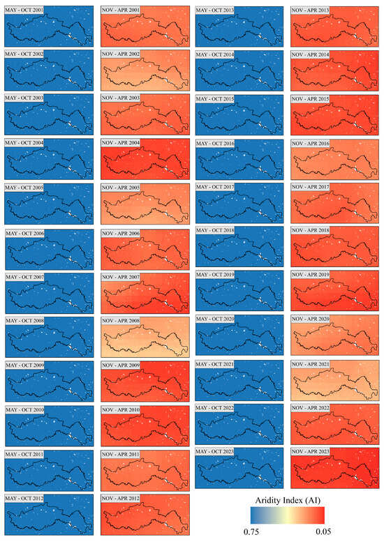 The Aridity Index (AI) was computed as the ratio of total precipitation to total PET for each seasonal window: