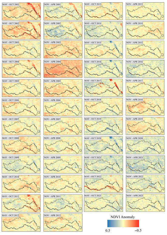 The dry season revealed more pronounced fluctuations in NDVI anomalies. Prior to 2003, positive anomaly values were dominant, indicating generally vigorous vegetation growth. From 2003 to 2006, NDVI values declined sharply, pointing to severe dry conditions that suppressed vegetation greenness. A period of partial recovery began in 2008, as positive anomalies reappeared in several zones. Negative NDVI anomalies re-emerged in 2018–2019, while strong positive anomalies in 2021–2022 suggested a recent improvement in vegetation conditions during the dry months.