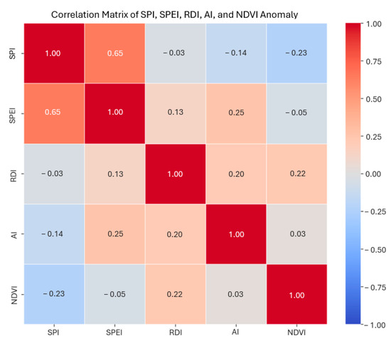 Seasonal index values were averaged to represent annual conditions and compiled into a correlation matrix. Pearson correlation coefficients were then computed using Python to evaluate the strength and direction of the relationships between meteorological drought indices and NDVI anomaly. The resulting matrix provided quantitative evidence to interpret how well each drought index reflected the observed vegetation response over the full study period.