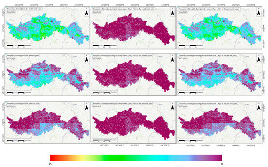 Spatial distribution of drought frequency in the Thung Kula Ronghai region over the past 20 years (2004–2023), 10 years (2014–2023), and 5 years (2019–2023). The left column shows the overall drought frequency for each multi-year period. The central column presents drought frequency during the wet season (May–October), while the right column displays drought frequency during the dry season (November–April). The frequency scale represents the number of drought occurrences, where purple indicates areas with no drought events and red denotes the highest frequency.