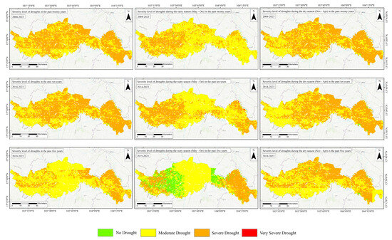 Spatial distribution of drought severity levels in the Thung Kula Ronghai region during the past 20 years (2004–2023), 10 years (2014–2023), and 5 years (2019–2023). The left column presents overall drought severity for each multi-year period, the central column shows drought severity during the wet season (May–October), and the right column depicts drought severity during the dry season (November–April). Severity is classified into four levels: No Drought (green), Moderate Drought (yellow), Severe Drought (orange), and Very Severe Drought (red).
