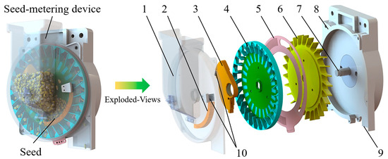 The structure diagram of device. 1. Front shell, 2. infeed groove, 3. seed barrier, 4. composite seeding tray, 5. seed delivery board, 6. guide wheel, 7. seeding shaft, 8. rear shell, 9. seed-throwing port, 10. seed-protecting brush.