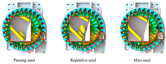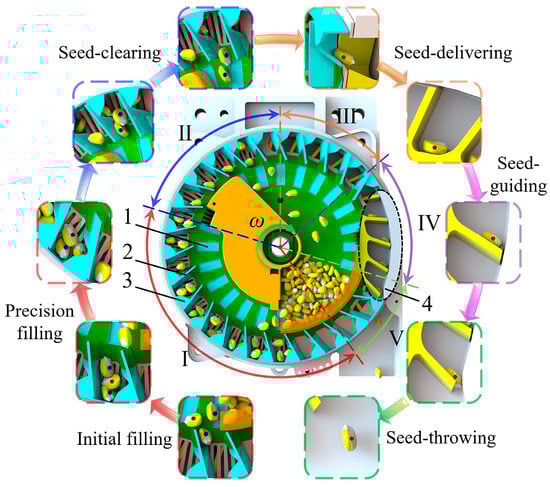The seed-metering device’s working principle can be divided into five processes: seed-filling, seed-clearing, seed-delivering, seed-guiding, and seed-throwing (Figure 2). To enhance the seed-filling effectiveness during high-speed seeding, the seed-metering device adopts the quantitative precision filling method, and the seed-filling process can be refined into two stages: initial quantitative filling (initial filling) and single-seed precision filling (precision filling). When the seeds enter the seed chamber from the front shell, they converge to the top of the infeed groove and are evenly and orderly dispersed into the seed grid under the driving effect of the grooved teeth, completing the initial filling. After the initial filling, the grid contains only the right amount of seeds (1 to 4 seeds), which does not block the opening of the seed dispenser due to an excessive amount of seeds. With the rotation of the seeding tray, the seeds in the grid slide rapidly relative to the seed dispenser. The first single seed to reach the opening of the seed dispenser quickly takes up the internal space of the seed dispenser, realizing the precision filling of a single seed. The other seeds continue to slip into the seed group as the seed grid passes through the seed-clearing area. The single seed continues to move to the seed-delivering area and slide into the compartment at the edge of the guide wheel. It is along the guiding curved surface of the rear shell to the seed-throwing port and then falls vertically [23]. The delivering, guiding, and throwing are completed sequentially.