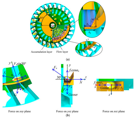 The structure diagram of seed barrier and infeed groove. (a) The driving force for the seed supply process. (b) The force system diagram of a single seed in each coordinate plane.