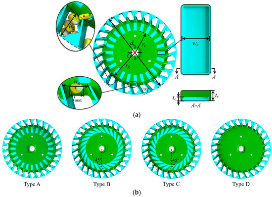 In order to investigate the influence of the shape of the grooved teeth on the effect of seed-filling, the vertical grooved teeth, as the base type A and three additional grooved teeth structures were compared. Among them, the grooved teeth were inclined 45° to the left as type B, 45° to the right as type C, and the non-grooved tooth structure type D was used as an experimental control (Figure 4b). Meanwhile, it is important to ensure that the role and distribution of the grooved teeth structure are reasonable and easy to process and manufacture. The width of the grooved teeth wc should not be too large or too small. In this study, we took 8 mm, and the radius of the teeth top rc was 60 mm. The depth of the grooved teeth tc was taken as a parameter to be optimized, and its value was set to be in the range of 0.5–1.5 mm according to the the pre-test effect.