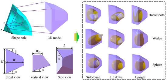 To ensure the reliable effect of single-seed precision filling, the adaptability of the seed dispenser for single seeds should be enhanced. Its internal space is designed with irregular geometry, and the main structural parameters include hole height H, hole width W1, end width W2, hole depth L, hole inclination γ1, and hole declination γ2 (Figure 6). Based on the three different types of postures (side-standing, lying down, and standing) of different types of seeds (Figure 6), the ranges of some parameters can be identified as follows: