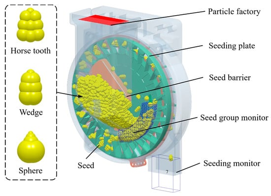 The simulations modeled particle-to-particle and particle-to-geometry contacts using the Hertz–Mindlin (no-slip) contact model [29]. A 3D model of the seed-metering device was created using SolidWorks2021 (Dassault Systemes, Concord, MA, USA) and imported into EDEM2022. The particle model was established based on the actual seed shape and the range of triaxial dimensions using ball splicing. The triaxial dimensions of each type of seed were normally distributed in the ratio of 6:3:1 (Figure 9).