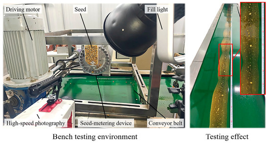 Calculations indicate that when the operating speed of the seed-metering device is 20, 25, 30, and 35 r·min−1, respectively, the corresponding operating speeds are 8, 10, 12, and 14 km·h−1, respectively.