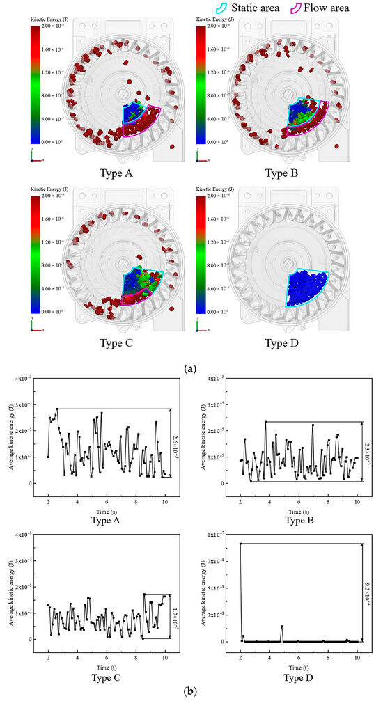 The trend of the average kinetic energy of the flow layer with time for each type of grooved teeth is shown in Figure 11b. The average kinetic energy of type A fluctuates in the range of 2.6 × 10−5 J, and the average value is 1.32 × 10−5 J, both of which are the highest. The following are type B and type C, with fluctuation ranges of 2.3 × 10−5 J and 1.7 × 10−5 J, respectively, and mean values of 8.36 × 10−6 J and 8.1 × 10−6 J, respectively. Type D has the smallest fluctuation ranges and mean values of mean kinetic energies, which are 9.2 × 10−8 J and 1.47 × 10−9 J, respectively. It indicated that the type A grooved teeth had the most significant disturbance to the flow layer, the highest seed mobility, and the most potent seed supply capacity. The reason is that the direction of the friction force exerted on the seeds by the type A grooved teeth is almost the same as the direction of motion of the seeds, and the seeds flow faster, resulting in a more significant disturbance of the seed group, which has the highest average kinetic energy. The direction of the friction force exerted on the seed by the type B and C grooved teeth deviates from the direction of seed motion, and the seed is subjected to less driving force and slower flow speed, resulting in less disturbance of the seed group and a lower average kinetic energy.