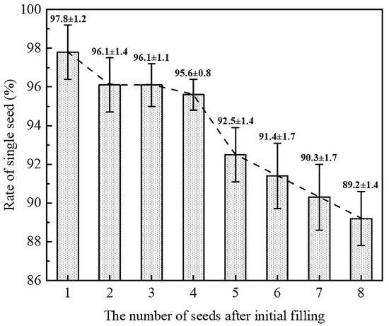 The single-seed filling rate shows a decreasing trend with an increase in the number of seeds after the initial filling. When the initial filling number of seeds did not exceed four grains, the single-seed filling rate declined gently, and the overall decline was relatively small, all remaining above 96%. The decrease in the single-seed filling rate increased when the number of initial filling seeds was more than four. When the number of initial filling seeds was raised from four to eight, the single-seed filling rate decreased by 9.2 percentage points. It can be analyzed that an increase in the number of seeds initially filled leads to an increase in the number of seeds accumulating around the seeds to be filled. The contact of the seeds to be filled with many seeds increases the filling hindrance, thus decreasing the probability that the seed dispenser will achieve single-seed filling.