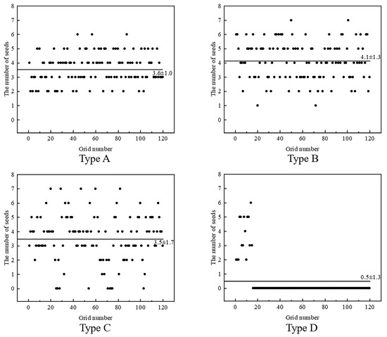 The mean values of the number of initial filling seeds corresponding to the type A, B, and C grooved teeth are 3.6, 4.1, and 3.5, respectively, with a relatively small overall difference. The number of initial filling seed’s SD corresponding to the type A grooved teeth is 1.0, the smallest, followed by type B and C with 1.3 and 1.7, respectively. It indicated that the number of initial filling seeds was more concentrated, and the seed-filling effect was more stable in the type A grooved teeth condition. The mean value of the initial filling number of seeds corresponding to the type D non-grooved teeth structure was 0.5, and the SD was 1.3. However, the interruption of seed supply in this condition led to the frequent occurrence of the number of initial filling seeds with 0, which resulted in successive leakage filling. It could not satisfy the demand for seed-filling. Therefore, type A grooved teeth had the best seed-filling effect, followed by types B and C.