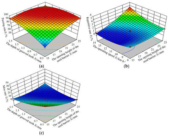 The significance test results of the model are shown in Table 5. The results showed that the quadratic regression models for the passing rate Y1, the repetitive rate Y2, and the miss rate Y3 were all highly significant (p ≤ 0.01), and their lack of fit terms were not significant (p ≥ 0.05), indicating that the regression models had a high degree of fit. In the regression model of Y1, the influences of X1, X2, X1 X2, X12, X22, and X32 on the model are highly significant, the influence of X3 on the model is significant, the influences of the rest of the terms on the model are insignificant, and the significant degree of the factors is X1, X2, and X3 in descending order. In the regression model of Y2, the influences of X1, X1 X3, X12, X22, and X32 on the model are highly significant, the influence of X3 on the model is significant, the influences of the rest of the terms on the model are insignificant, and the significant degree of the factors is X1, X3, and X2 in descending order. In the regression model of Y3, the influences of X1, X2, X1 X2, X12, X22, and X32 on the model are highly significant, the influence of X3 on the model is significant, the influences of the rest of the terms on the model are insignificant, and the significant degree of the factors is X1, X2, and X3 in descending order.