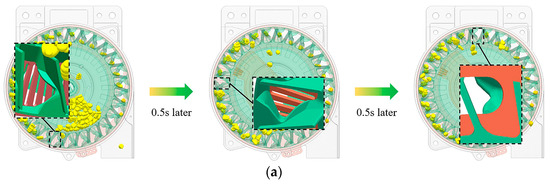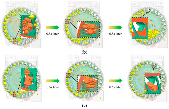 In the simulation comparison experiment, the opening height of the seed barrier was set at 20 mm, and the depth of the grooved teeth was set at 1 mm. In order to ensure that the effect of high-speed operation is reliable, the experiment was carried out at an operation speed of 14 km·h−1 (corresponding to a rotational speed of 35 r·min−1).