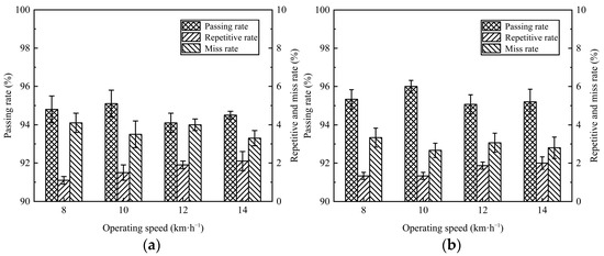 In Figure 16, when the operating speed is maintained in the range of 8 to 14 km·h−1, the passing rate of the seed-metering device is between 94.1% and 95.1%. The overall passing rate is relatively stable, with the increase in operating speed showing a slightly fluctuating trend of increasing and then decreasing. However, the overall difference is slight, without significant abrupt changes. It is indicated that by limiting the number of seeds in front of the filling port, the quantitative precision filling method can eliminate the centrifugal extrusion and mutual restraint effect of the seed groups triggered by high speed and realize the single-seed precision filling, which can effectively enhance the adaptability of high-speed operating of mechanical precision metering devices.