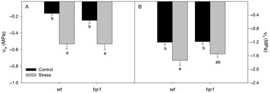 Water relation: Leaf water potential (Ψw, (A)) and leaf osmotic potential (Ψs, (B)) of wt and hp1 Micro-Tom genotypes exposed to two contrasting environmental treatments (control and combined stress of water deficit and high irradiance) for 7 days. Bars represent means ± SEM (n = 10). Mean values with the same letter are not significantly different by the Tukey test (p ≤ 0.05).