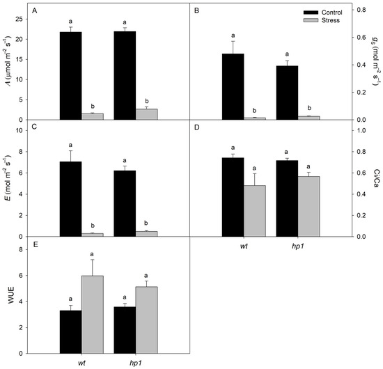 Gas exchange: Photosynthesis rate (A, (A)), stomatal conductance (gS, (B)), transpiration rate (E, (C)), ratio of internal to external CO2 concentration (Ci/Ca, (D)), and intrinsic water use efficiency (WUE, (E)) of wt and hp1 Micro-Tom genotypes exposed to two contrasting environmental treatments (control and combined stress of water deficit and high irradiance) for 7 days. Bars represent means ± SEM (n = 10). Mean values with the same letter are not significantly different by the Tukey test (p ≤ 0.05).