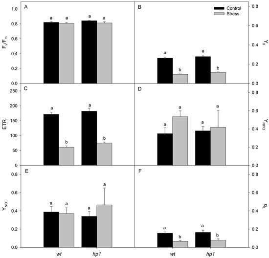 Chlorophyll fluorescence: Potential quantum yield of PSII (Fv/Fm; (A)), effective quantum yield of PSII (YII; (B)), electron transport rate (ETR; (C)), regulated energy dissipation quantum yield (YNPQ; (D)), unregulated energy dissipation quantum yield (YNO; (E)), and fraction of open PSII reaction centers (qL; (F)) of wt and hp1 Micro-Tom genotypes exposed to two contrasting environmental treatments (control and combined stress of water deficit and high irradiance) for 7 days. Bars represent means ± SEM (n = 10). Mean values with the same letter are not significantly different by the Tukey test (p ≤ 0.05).
