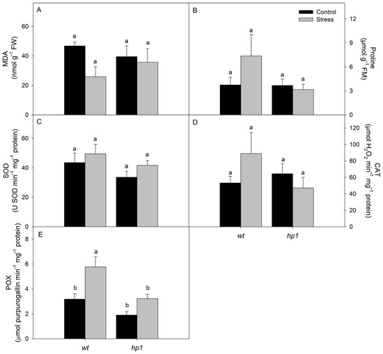 Biochemical traits: Malondialdehyde (MDA; (A)), proline (PRO; (B)), and activities of superoxide dismutase (SOD; (C)), catalase (CAT; (D)), and peroxidase (POX; (E)) of wt and hp1 Micro-Tom genotypes exposed to two contrasting environmental treatments (control and combined stress of water deficit and high irradiance) for 7 days. Bars represent means ± SEM (n = 10). Mean values with the same letter are not significantly different by the Tukey test (p ≤ 0.05).