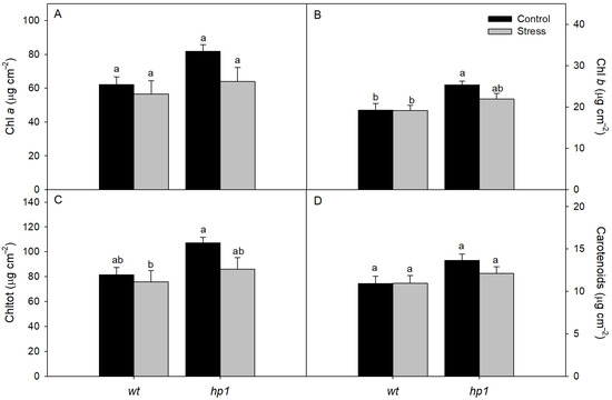 The hp1 mutant accumulated greater amounts of photosynthetic pigments—including chlorophyll a, chlorophyll b, total chlorophyll, and carotenoids—than the wt genotype (Figure 5).