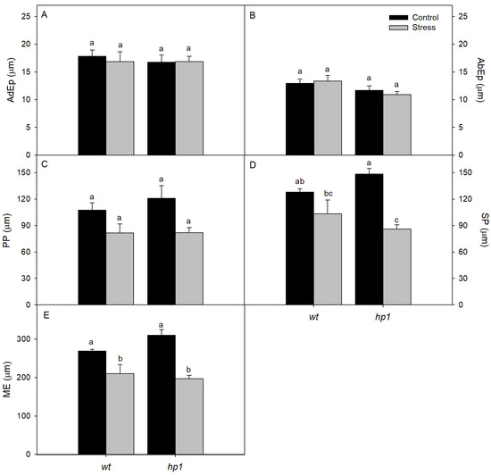 Under control conditions, hp1 exhibited greater PP thickness than the wt genotype. This difference was not maintained under combined stress, where both genotypes exhibited comparable values. A similar trend was observed for SP and ME thickness: Under control conditions, hp1 showed higher values than wt, but under combined stress, the reverse was observed (Figure 6 and Figure 7).
