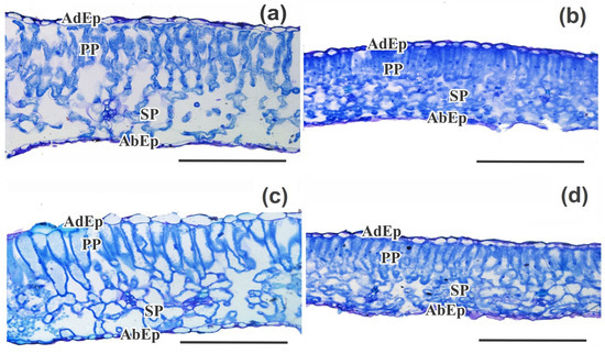 Leaf samples from the median region of fully developed leaves were collected and immediately fixed in Karnovsky’s solution [39]. The samples were first rinsed with phosphate buffer, then dehydrated through a series of ethanol solution, followed by pre-infiltration with historesin (Leica Instruments, Heildelberg, Germany). Transverse sections (5 μm thick) were cut out using a rotary microtome (model 1508R, Logen Scientific, Jinhua, Zhejiang, China) and stained with 0.05% toluidine blue in 0.1 M phosphate buffer at pH 6.8 [40]. Structures analyzed included the adaxial epidermis (EpAd), abaxial epidermis (EpAb), palisade parenchyma (PP), spongy parenchyma (SP), and mesophyll (ME). Images were captured with an Olympus BX61 microscope (Tokyo, Japan) equipped with a DP 72 camera (brightfield mode) and processing using Image J software v. 1.8.0_172 (National Institutes of Health, Bethesda, MD, USA).