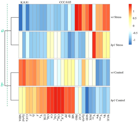 Dendrogram associated with a heatmap of the physiological, biochemical, and anatomical characteristics of wt and hp1 Micro-Tom genotypes exposed to two contrasting environmental treatments (control and combined stress of water deficit and high irradiance) for 7 days. Ψw, predawn water potential; Ψs, osmotic potential; A, photosynthetic rate; gS, stomatal conductance; E, transpiration, Ci/Ca, the ratio between internal and external; WUE, intrinsic water use efficiency; Fv/Fm, potential quantum yield of photosystem II (PSII); YII, effective quantum yield of photochemical energy conversion in PSII; YNPQ, non-photochemical extinction coefficient; ETR, electron transport rate; Chl a, chlorophyll a; Chl b, chlorophyll b; Chl tot, total chlorophyll; Crt, carotenoids; MDA, malondialdehyde content; PRO, proline concentration; SOD, superoxide dismutase activity; CAT, catalase activity; POX, peroxidase activity; EpAd, adaxial epidermis; EpAb, abaxial epidermis; PP, palisade parenchyma; SP, spongy parenchyma; ME, mesophyll. a and b represent the cluster division resulting from the hierarchical clustering analysis.