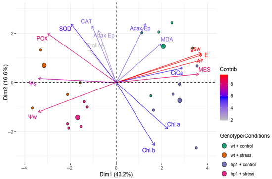 Principal component analysis (PCA) indicated that the first two principal components (PC1 and PC2) explained 59.8% of the variation (Figure 9). The scores observed for wt plants under combined stress were 0.9228 [A] + 0.9075 [gS] + 0.9144 [E]. The largest effect in hp1 under stress was 0.8803 [ME] (PC1). PC2 was mainly affected by 0.48319 [POX] and −0.2923 [Ψw] in the hp1 mutants under stress.