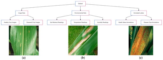 Lastly, environmental sensor data form the third component of the dataset. IoT-enabled sensors, strategically deployed across the fields, recorded key parameters such as temperature (15–35 °C), soil moisture (10–60%), and humidity (40–90%), as described in Figure 1c. These data points were logged at 15 min intervals and synchronized with the drone imagery using timestamps [33]. The integration of environmental data provides a contextual layer, enabling the model to account for conditions that influence disease progression.