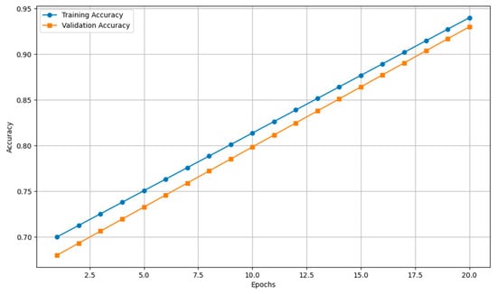 Figure 2 illustrates the learning progression of AgriFusionNet over 20 epochs for both training and validation phases. The curve reveals a stable and consistent increase in accuracy, with minimal divergence between training and validation trajectories, indicating effective generalization and low risk of overfitting. The model reaches approximately 94% validation accuracy by the final epoch, outperforming comparative architectures in convergence rate. This rapid stabilization can be attributed to the synergistic effect of the Fused-MBConv blocks and Swish activation, which together facilitate smoother gradient flow and enhanced feature discrimination during training. The smooth convergence behavior confirms that AgriFusionNet is not only accurate but also computationally stable, which is critical for real-time agricultural applications where retraining efficiency is essential.