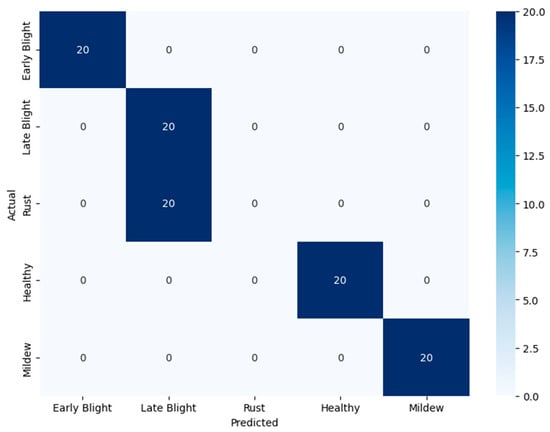 Multimodal fusion contributed to increased robustness under variable field conditions. Validation was performed across four distinct agricultural sites demonstrating consistent accuracy, which affirms the model’s generalization strength across geographies. Figure 3, the confusion matrix, revealed that the most common misclassification occurred between early and late blight, largely due to overlapping symptom presentation and environmental noise.