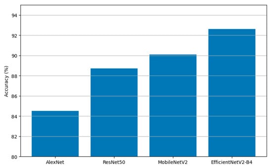 To provide a foundational assessment of the backbone architecture used in AgriFusionNet, we conducted a baseline evaluation of EfficientNetV2-B4 using RGB-only data from the widely adopted PlantVillage dataset. This experiment was designed to benchmark its performance against other lightweight deep learning models, including AlexNet, ResNet50, and MobileNetV2, under the same single-modal conditions. By isolating the RGB modality, we aimed to objectively assess the classification accuracy and inference efficiency of EfficientNetV2-B4 before introducing the advantages brought by multimodal data fusion.