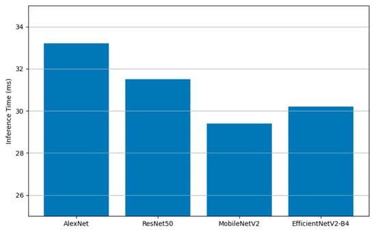 As shown in Table 7, EfficientNetV2-B4 outperforms other models in terms of accuracy while maintaining competitive inference speed. These results validate the selection of EfficientNetV2-B4 as a foundation for AgriFusionNet. Figure 4 visualizes the accuracy of each model on the RGB-only dataset and Figure 5 illustrates the inference time required by each model. These results confirm the baseline strength of EfficientNetV2-B4, justifying its role in our multimodal fusion approach while highlighting the further improvements introduced by AgriFusionNet.