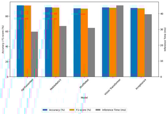 To validate the effectiveness of AgriFusionNet, we compared its performance with widely recognized deep learning models, including Vision Transformers, InceptionV4, MobileNetV3, and ShuffleNet. As shown in Table 6 and supported by Figure 6, AgriFusionNet outperformed these models in terms of classification accuracy, inference time, and F1-score. The inclusion of Fused-MBConv blocks enabled efficient gradient propagation, and Swish activation improved the sensitivity to subtle visual cues present in complex crop symptoms. Unlike Vision Transformers, which are resource-intensive and slower during inference, AgriFusionNet achieves a compelling balance of speed and accuracy, making it more appropriate for real-time applications in agricultural settings.