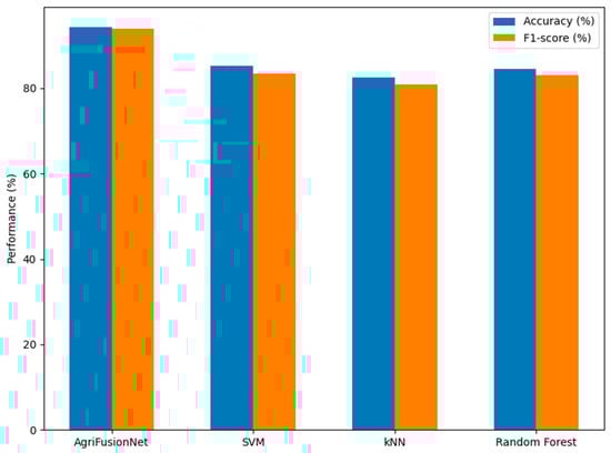 We further benchmarked AgriFusionNet against traditional machine learning approaches such as Support Vector Machines (SVMs), k-Nearest Neighbors (kNNs), and Random Forests (RFs). These models were trained using handcrafted features derived from the same multimodal dataset. Although deep learning architectures have shown superior performance in image-based tasks, comparing AgriFusionNet with traditional machine learning (ML) classifiers such as SVM, RF, and KNN remains essential for establishing a clear performance baseline. This comparison helps to contextualize the magnitude of improvement achieved through deep feature extraction, especially when applied to multimodal agricultural datasets. Furthermore, traditional ML approaches are often easier to deploy and computationally efficient, which makes them attractive in resource-constrained settings. Therefore, highlighting the performance gap justifies the adoption of deep models in practical farming scenarios.