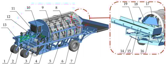 The excavation and conveying device is mainly composed of a separation screen, an excavation shovel, a connecting plate, an auxiliary feeding soil-breaking rotary tiller, a support shaft, and other components. The structural diagram is shown in Figure 5. The soil-crushing rotary tiller is installed on the upper part of the digging shovel. When working, the digging shovel will turn over stones, soil mixtures, etc., and transport them backwards. The rotary tiller will crush some of the dug soil blocks and separate the film, weeds, etc., on the soil surface to prevent the roller from being entangled during the backward transportation and separation process. The stone and soil mixture after preliminary separation is transported to the separation screen, which is driven by the driving shaft to perform secondary separation on the stone and soil mixture and then transport it to the drum.