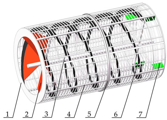 Schematic diagram of the spiral drum separation device: 1. Closing plate. 2. Auxiliary feeding fan. 3. Central support shaft. 4. Main cylinder. 5. Sprocket ring. 6. Spiral blade. 7. Scraper.