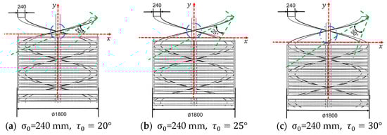 It can be seen from Formula (1) that different combinations of parameters and will result in different spiral blade curve equations. In order to ensure that the stone is quickly transported backward along the sliding surface of the spiral blade, it is necessary to ensure that the sliding angle at any point on the sliding curve is greater than the friction angle between the stone and the spiral blade [18]. According to the design requirements of the “Agricultural Machinery Design Manual” [19], = 240 mm and = 4.8 mm/rad. In order to explore the sliding cutting effect of different spiral blade starting sliding cutting angles , this paper designed three different spiral blade starting sliding cutting angles , , and and carried out stone-picking performance tests, as shown in Figure 4.