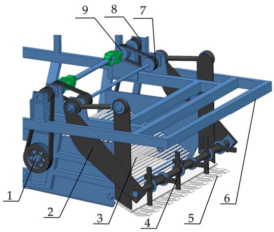 Schematic diagram of the structure of the excavation and conveying device: 1. Drive shaft. 2. Connecting plate. 3. Separation screen. 4. Auxiliary feeding rotary tiller. 5. Excavation shovel. 6. Frame. 7. Transmission shaft. 8. Drive shaft fixing plate. 9. Drive pulley.